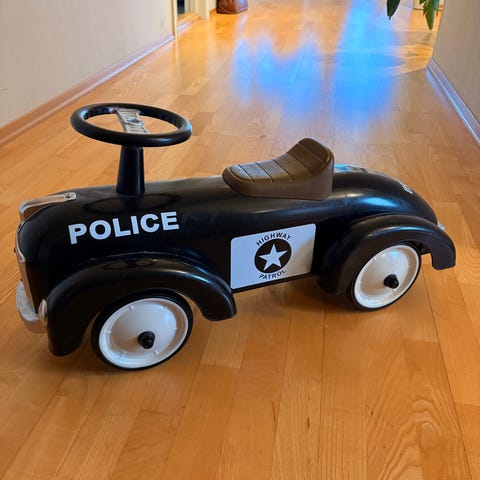 Pent brukt og skikkelig tøff gåbil i Politi-design. Solid karosseri i metall. Perfekt leke for en liten gutt eller jente som drømmer om å bli politi.