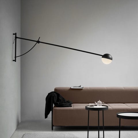 Lampens sfæriske skjerm er montert på en metallarm som er festet til en buet arm. Alle leddene er dreibare, slik at lyset kan justeres dit du trenger belysning. Skjermen kan også roteres slik at du har muligheten for et direkte eller indirekte lys. Plasser den ved sofagruppen eller bruk den som sengelampe, der den både kan brukes som koselig belysning eller som et praktisk leselys.