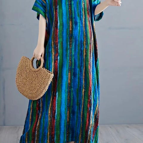 Bohemian Plus Size Maxi Kjole med Lommer - Vibrant Stripet Mønster, Kort Erme, V-hals, Løs Passform, Perfekt for Vår/ Sommer/Høst, Casual Wear | Vibrant Stripet Kjole | Tekstur 100% viskose