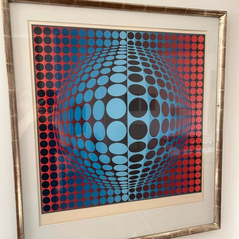 Victor Vasarely Vega Tek med en iøynefallende design i rød og hvit. Kunstverket viser et geometrisk mønster med en tredimensjonal effekt, typisk for Vasarelys stil.