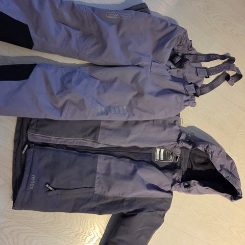 Blå vinterjakke med hette fra H&M i str.128. Vanntett og vindtett. Pent brukt. 250kr.