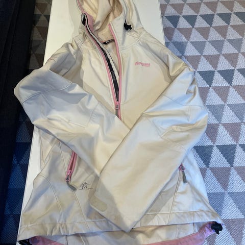 Denne jakka får jeg ikke på meg lenger dessverre. Nusfjord lady jacket. Softshelljakke fra Bergans i en blå/lilla farge med rosa detaljer. Lite brukt men har en flekk på forsiden (se bilde) og noen bruksflekker i ermene og i kragen. Kan sende flere bilder av dette. Ellers ingen hull