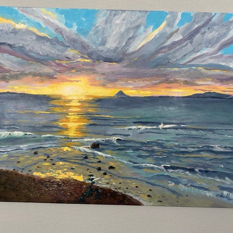Et unikt, abstrakt maleri inspirert av naturens øyeblikk - der hav og himmel møtes i det første morgenlyset. "Morgengry over havet" fanger den stille magien som oppstår når solen bryter horisonten og fargene begynner å danse over vannflaten.