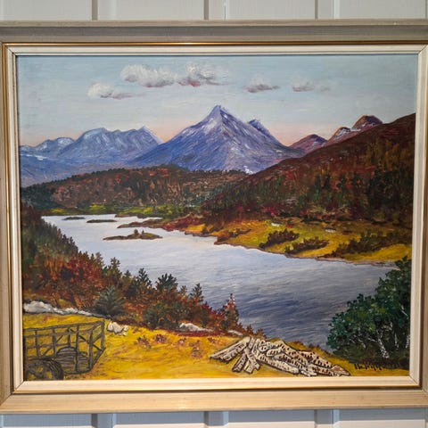 Dette er et landskap malt på tykt akvarellpapir med akvarellmaling. Fargevalget er kaldt og vinterlig. Verket er i A4-størrelse.