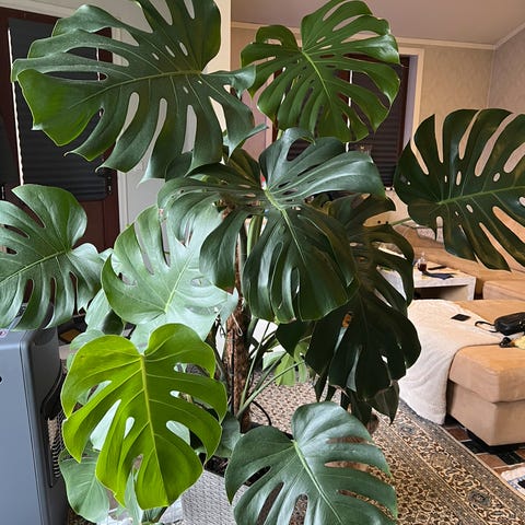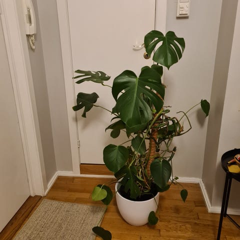 Denne nydelige monstera-planten kjøpte vi i februar, og den trives ekstremt godt. Den har lange luftrøtter som er et tydelig sunnhetstegn. Bladene er grønne og fine. Vi får baby om bare noen få uker og vi ser at med alle baby-ting vi skal få plass til kan vi ikke lenger ha monsteraen som vår hoved-"piece" i stua lengre, derfor må Monstera få seg et nytt hjem🪴 Monstera er en plante det er enkelt å ta vare på, de trives med ikke altfor mye oppmerksomhet (ikke overvanning)💚