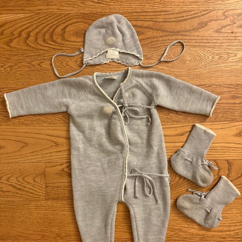 Nydelig og lite brukt Lillelam ullsett med dress, lue og sokker. Strl.68/ lue 40/42cm.