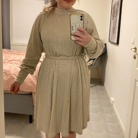 Kort glitterkjole. Aldri brukt, lappen henger på. Split foran og svart underkjole under. Blanding av sølv/gull i fargen