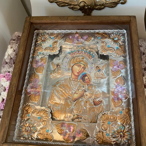 Det sentrale panelet viser Jomfru Maria (Madonna) med Jesusbarnet, mens sidepanelene sannsynligvis skildrer scener fra livet til Kristus eller andre helgener.