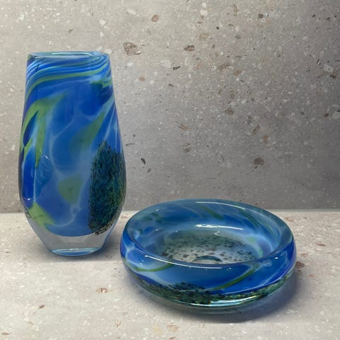 Vintage vaser og skål i krystall og håndblåst glass. Høye slanke vasen fra Randsfjord