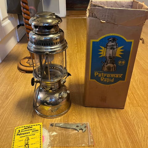 Lampa er i topp stand, Får pumpet opp trykk på tanken. Rensenål virker. Mest sannsynlig produsert på slutten av 80 tallet. Kassa viser at denne kommer fra militært lager. Ingen skade på tank. Men har fått litt patina som kan pusses bort med Autosol. Lampa har hurtigtenner ala Petromax. Men om man ikke liker å pumpe 50 slag så har lampa spritskål. Tar ut glasset og pakker det i egnet emballasje. Forskuddsbetaling. Har Vipps. Sender med Posten kr 182. Bruker ikke Fiks ferdig.