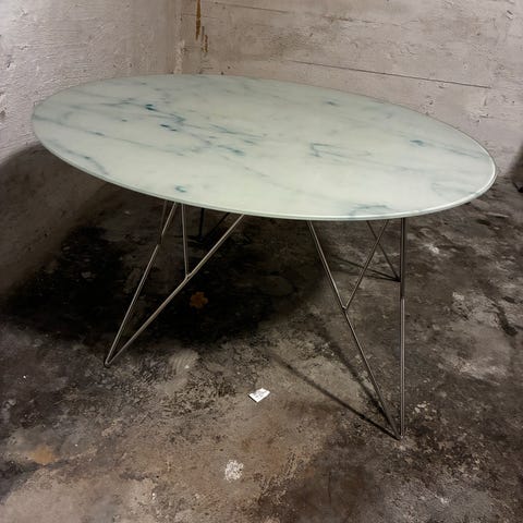 Rundt bord med steiner i mønster. Ukjent merke. Salongbord eller sidebord. Platen ligger løst på bena, men kan sikkert skrus fast.