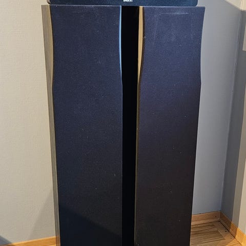 Dynabel hjemmekino anlegg, ikke blitt brukt de siste 10 årene. Fungerte veldig bra da det var i bruk. Rein og fyldig lyd, subwoffer i siden på gulvhøyttalerene. Senter høyttaler og bak høyttaler. Reciver er også av merke dynabel. Strømkabel mangler, men reciver kan følge med.