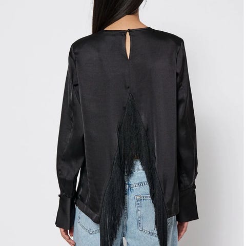 Glatt og shiny stoff med dekorative frynser bak på ryggen og ermene. Den har avslappet passform med rund hals og rett kant nederst. Lukkes med skjult glidelås bak i nakken.