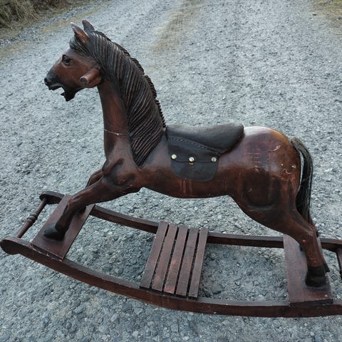 Selger en stor nostalgisk gyngehest i heltre. Kan sitte to barn på den samtidig. Solid bygd. Tåler også voksne. Malt i nostalgisk gammelrosa og hvitt.