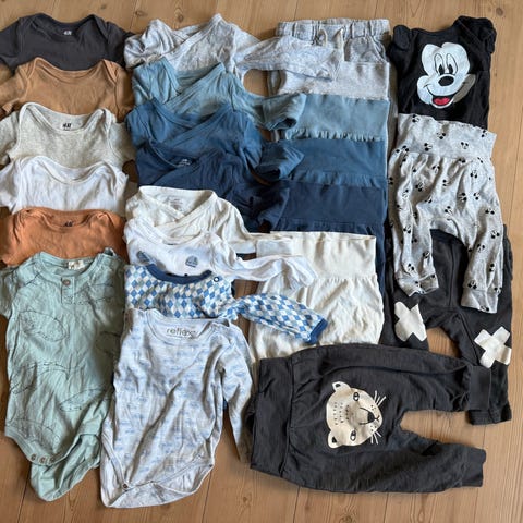 Pent brukt og ubrukte klær i størrelse 68 selges samlet. Pakken inneholder 15 plagg hvor plaggene kan matches med hverandre for flere antrekk.