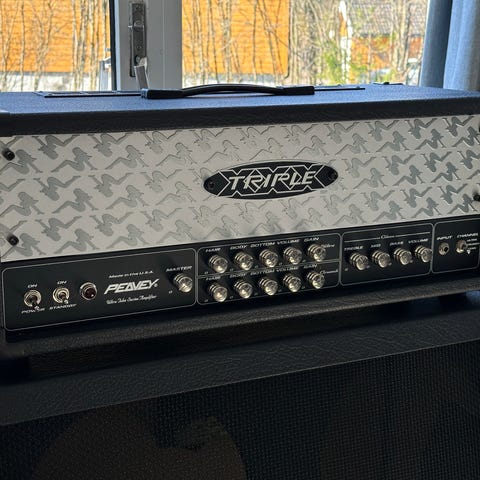 Har stort sett brukt den sammen med et Fenderkabinett med to 12’ Celestion høytalere, men også med et Marshall 4x12ˆ. Begge låter fett, men med Marshall blir det ekstra tungt og rocka.
