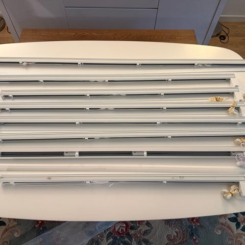 Pent brukte oppheng til panelgardin. De henges over gardinstang. 46cm bred. 1 sett inkluderer 2 overdeler og 2 lodd - metallstang som får gardiner til å henge rett og fint. Jeg har 6 sett. Selges samlet for 180kr