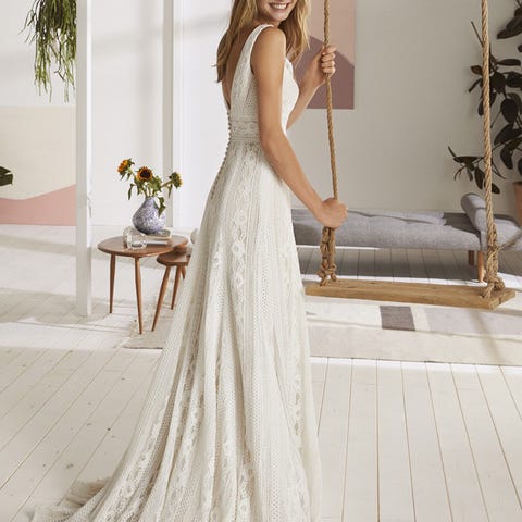 Kjolen har en elegant design med blonderdetaljer på overdelen og en lang slep. Perfekt for dem som vil ha en tidløs, klassisk og behagelig bryllups kjole. Elsker å ha den på meg. Så behagelig.