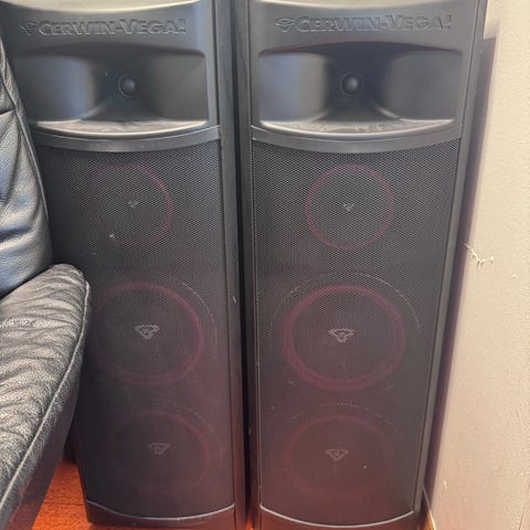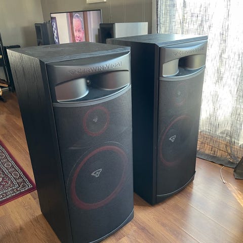 Cerwin Vega CLS 215 + Cerwin Vega A2.6 kw forsterker. Høyttalerne og forsterker fungerer utmerket. Med denne forsterkeren får høyttalerne skikkelig trøkk, klar lyd.