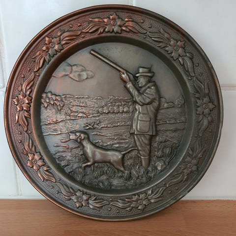 Pyntetallerken som kan henges på vegg. Samleobjekt? Med patina. Diameter 25 cm. Tror det er kobber. Den er tung, 754 gram.