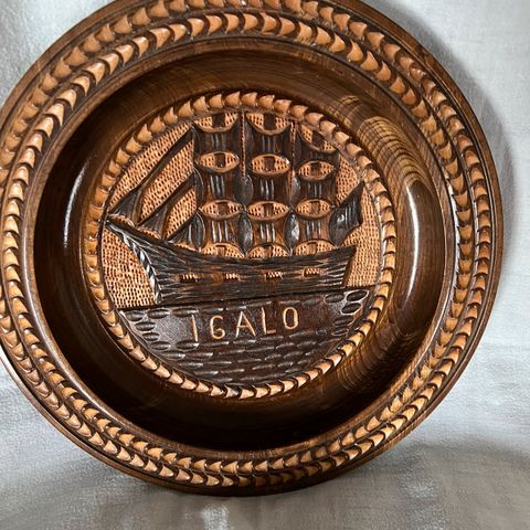 Jeg selger en veggplate i keramikk formet som en stekepanne. Den er dekorert inni med et maleri av natur med hav og fjell og et vikingskip. Det har teksten Kristiansand S.