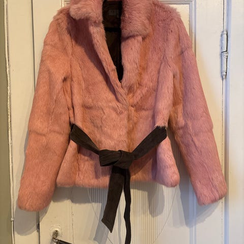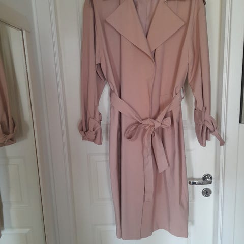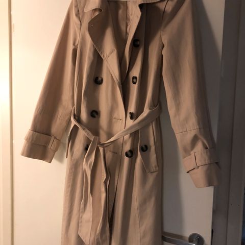 Lys gråblå. Med legg over skuldrene. Frakken rekker til midt på lårene. Hel og fin, lite brukt.