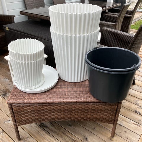 Potten ble kjøpt for 699,- og fatet for 179,-. Hel og pen, men kan ha litt sjatteringer i brunt siden den har vært i bruk med jord. Men dette synes i grunn ikke.