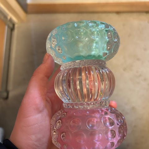 Rosa pyntetrær i glass fra Nille. Selges 40 kr samlet. 15,5 cm i høyde
