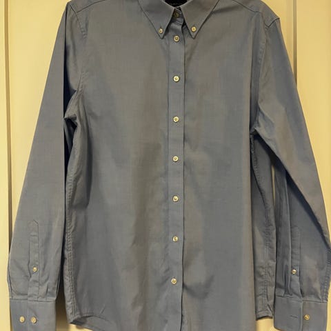 Pent brukt Hugo Boss herreskjorte i størrelse medium, kragestørrelse 39. Nydelig blåfarge i 100% bomull. Noen få bruksmerker (se bilder), men stort sett pent brukt. Vises på person som er 188 cm høy.