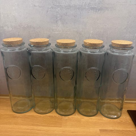 IKEA krukke sett med lokk består av tre krukker i farget glass. Disse krukkene er ideelle for oppbevaring av matvarer som syltetøy, krydder eller tørkede urter. De har en praktisk låsemekanisme som sikrer at innholdet holder seg friskt. Krukkene har en dekorativ funksjon og kan også brukes til å oppbevare små gjenstander i hjemmet. Fargene gir et varmt og innbydende utseende.