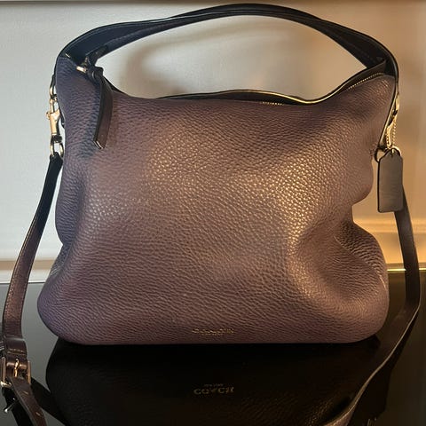 Liten skuldervæske til solbriller eller iPhone. Får plass til en liten iPhone Pro uten mobildeksel, men blir litt trang. Egner seg best til vanlig iPhone og solbriller.