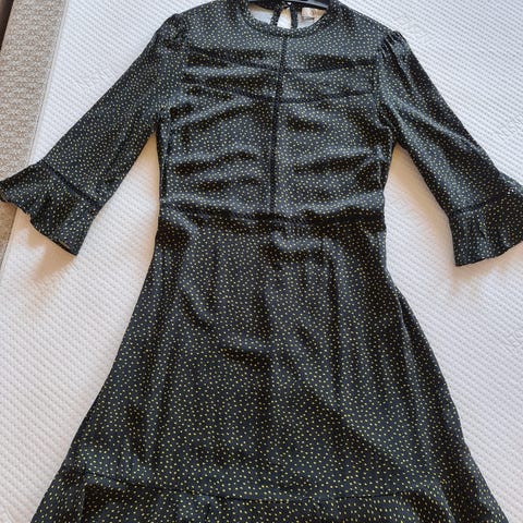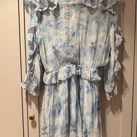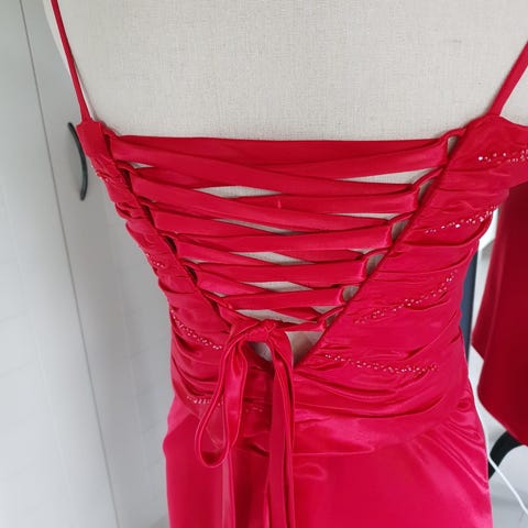 Vakker korallfarget sidkjole med capè i str M ( god i størrelse )