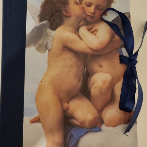 En helt ny bok, den rosa med kun et merke etter en lapp på bokryggen, en gråblå bok, revet ut noen sider i starten og et mindre merke på bokryggen.