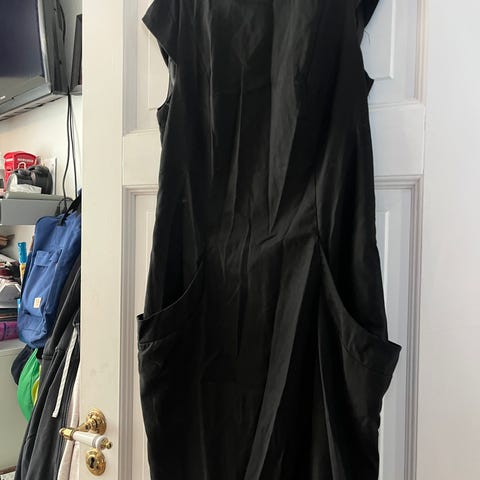 Fra Vero moda. Kjole med lommer i sidene, strikk i livet, albulange armer, kne langt skjørt, åpen nederst i ryggen, knappelukking bak. Veldig fin kjole. Polyester.