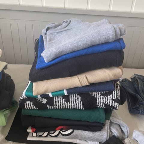 2 bukser, 1 kjole, 1 skjorte og en genser selges for 600. Alle klær untatt den røde buksa (som er blitt litt lysere i fargen) er som nye. Buksene har justerbar strikk.