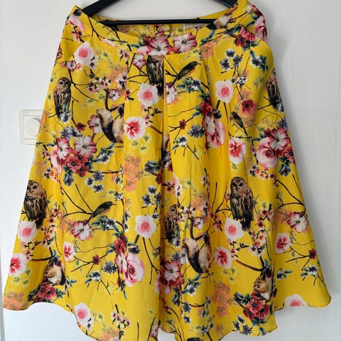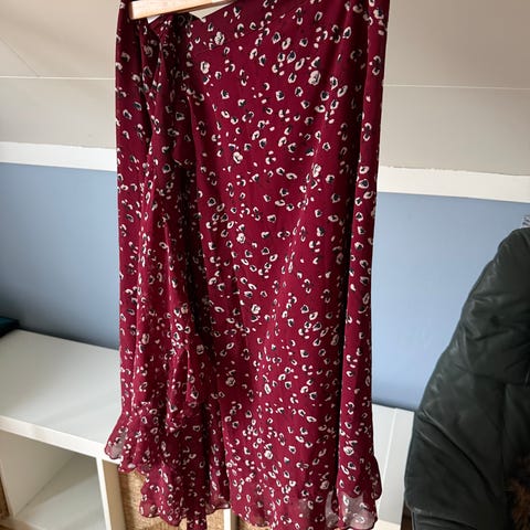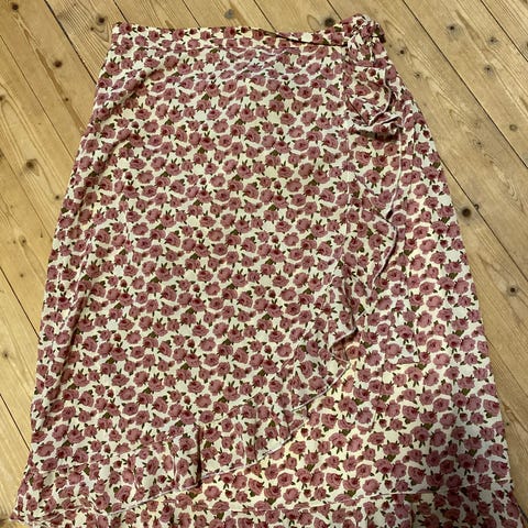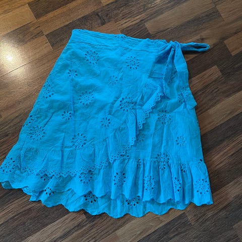 Nydelig omslagsskjørt i blåtoner, blomstrete. Med volangkant, knyting og strikk i livet. Går til leggen(jeg er 168cm)