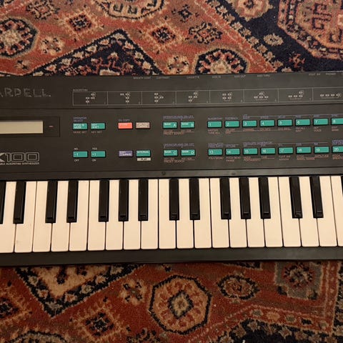 Modulen har 32 internminner for lyder og funksjoner, MIDI inn/ut/thru og klassisk 80‑talls digitale FM-klanger som pads, elpiano, bass og bells. I god stand, alderen tatt i betraktning og alt fungerer som det skal.