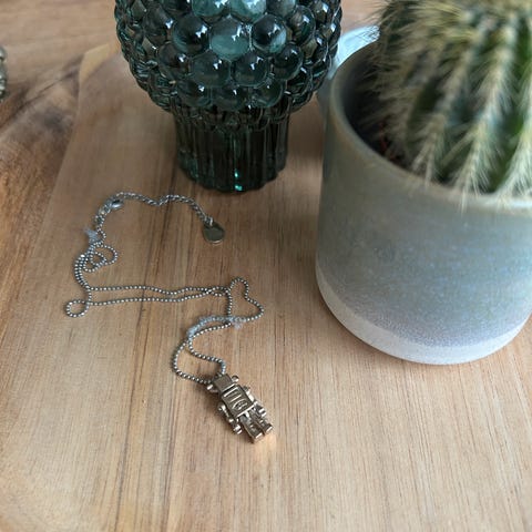 Stilig og morsomt halskjede med robotanheng i sølvfarget metall (golden alloy). Perfekt som en unik detalj til antrekket – enten til hverdags eller som gave.