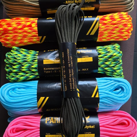 Har 14 stk fargerike nøkkelringer i 550 paracord. Har flettet de selv.