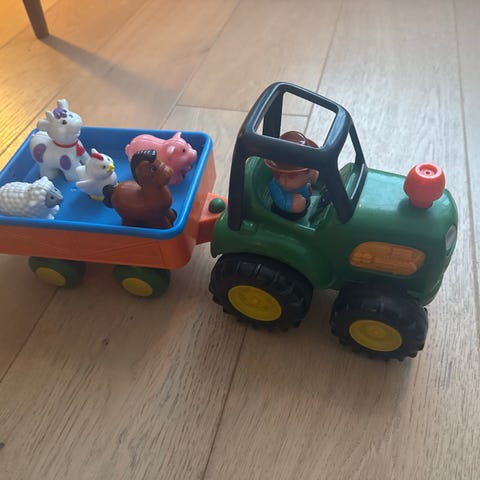 Traktor med tilhenger full av gårdsdyr, dyrene, bonden og traktor har knapper som lager aktuelle lyder + traktoren kan kjøre fremover