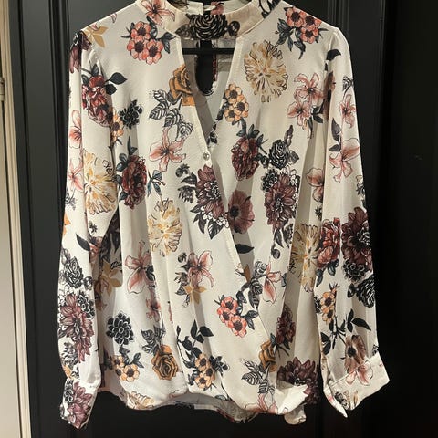 Utrolig søt bluse i str. 40 fra HM. Se det fine mønsteret og de lekre fargene! Blusen har for i front, og en stilig kant nederst fremme. Kledelig V-utringing. Lapp er klippet av, så vet ikke materiale. Meget pent brukt! 🧡