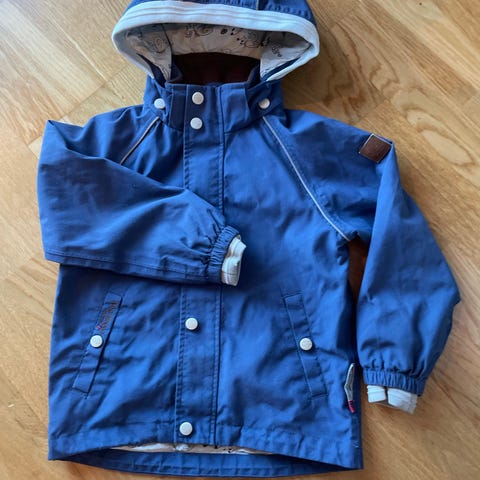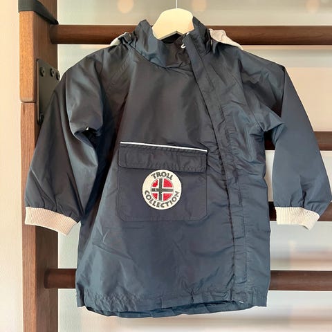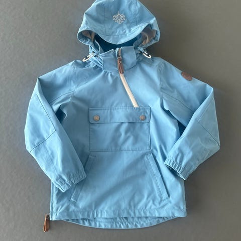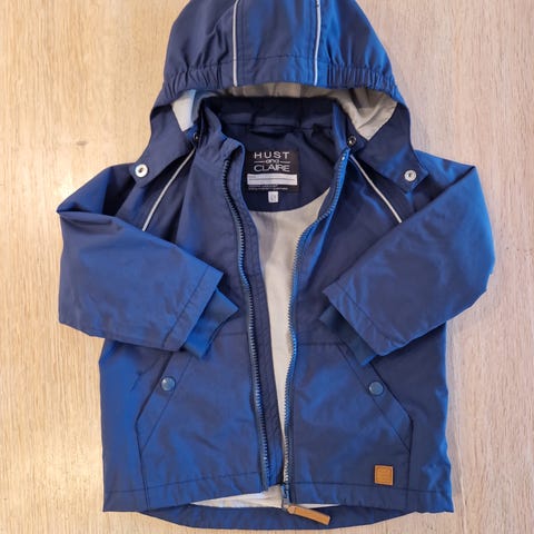 Flott vindjakke fra Hust i str. 92. Fin, lys blåfarge. Lys grått fôr i bomull .
