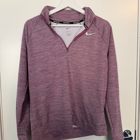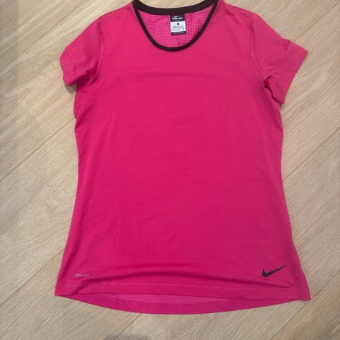 Nike Dri-FIT løpetrøye for dame i størrelse M. Trøyen er laget av et pustende materiale som passer godt til løping. Den kommer i en rosa farge og er designet for å gi komfort og bevegelsesfrihet under trening.