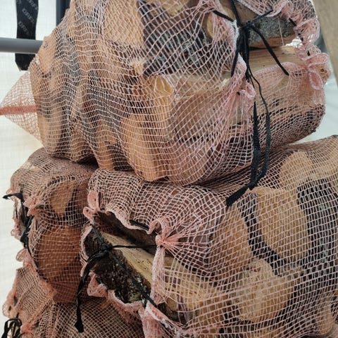 Tør og god granved i 60 liters sekker klar til bruk.