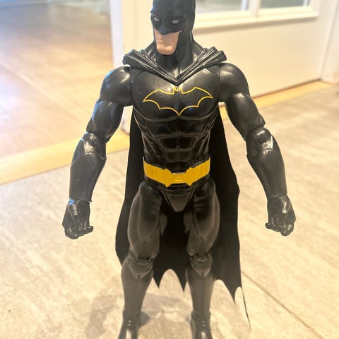 Batman actionfigur i svart og gull 16cm høy, Figuren har detaljerte trekk med en svart kappe og gullfargede rustningsdeler. Perfekt for samlere eller som leke for barn.