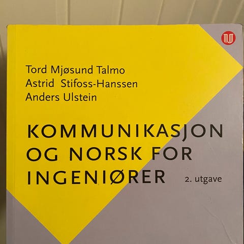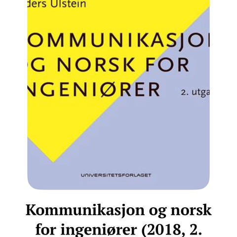 Selger boken "Kommunikasjon og norsk for ingeniører" (2. utgave). Man ser at boken er brukt, men sidene inni er helt fine.