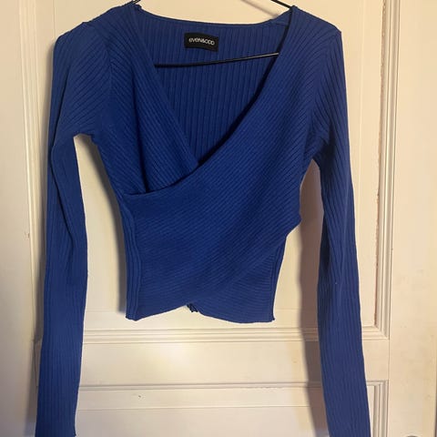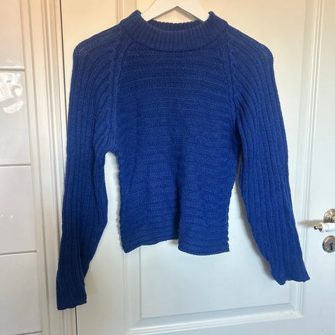 Blå oversized genser fra Even&Odd. Den er i str S men jeg bruker M-L til vanlig. Oversized på armene.
