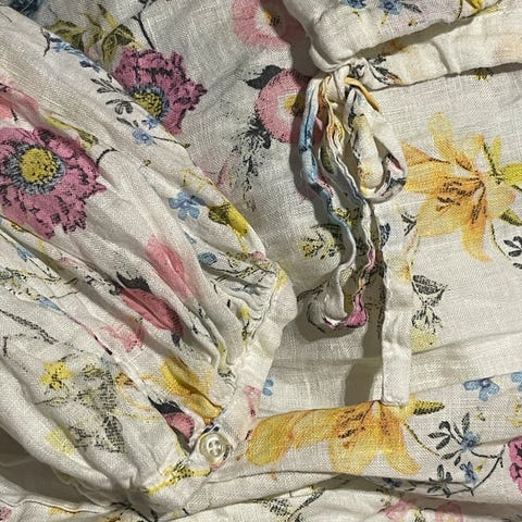 Selger shorts med fastsydd skjørt. Lett og behagelig stoff i hvitt med blomstret mønster. Lukking med knapp og glidelås i ryggen. Ingen synlige bruksmerker da det ikke har blitt brukt.
