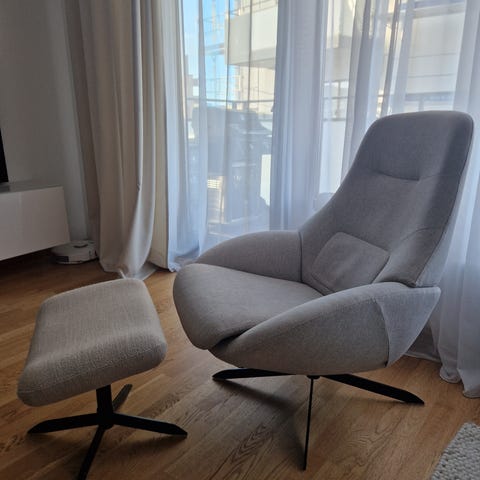 Vi vurderer å selge vår lite brukte Saga Grand lenestol med tilhørende nakkestøtte og fotskammel.
