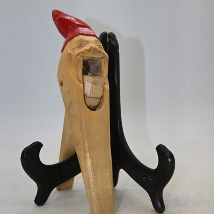 Sjelden og dekorativ nøtteknekker, håndlaget og utskåret i tre, trolig fra midten av 1900-tallet (ca. 1950–1970). Figuren forestiller en nisse med karakteristisk rød lue og er utskåret i et lyst, lett treslag – mest sannsynlig bjørk eller or, som var vanlige i skandinavisk treskjærerkunst.